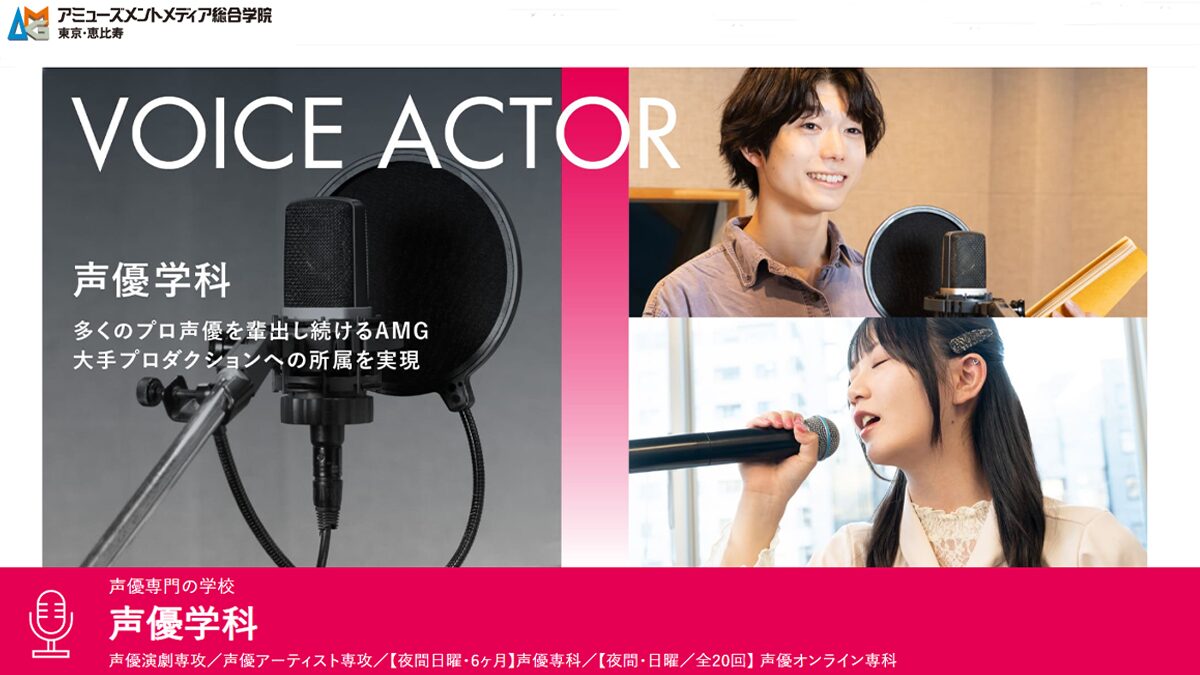 アミューズメントメディア総合学院(通称:AMG)は、声優を目指す人ならほとんどの人がチェックする声優専門学校(スクール)です。