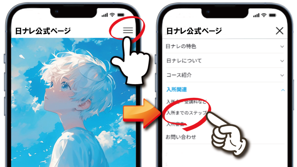 【メニューボタン ⇒ 入所関連 ⇒ 入所までのステップ】で確認できますよ。